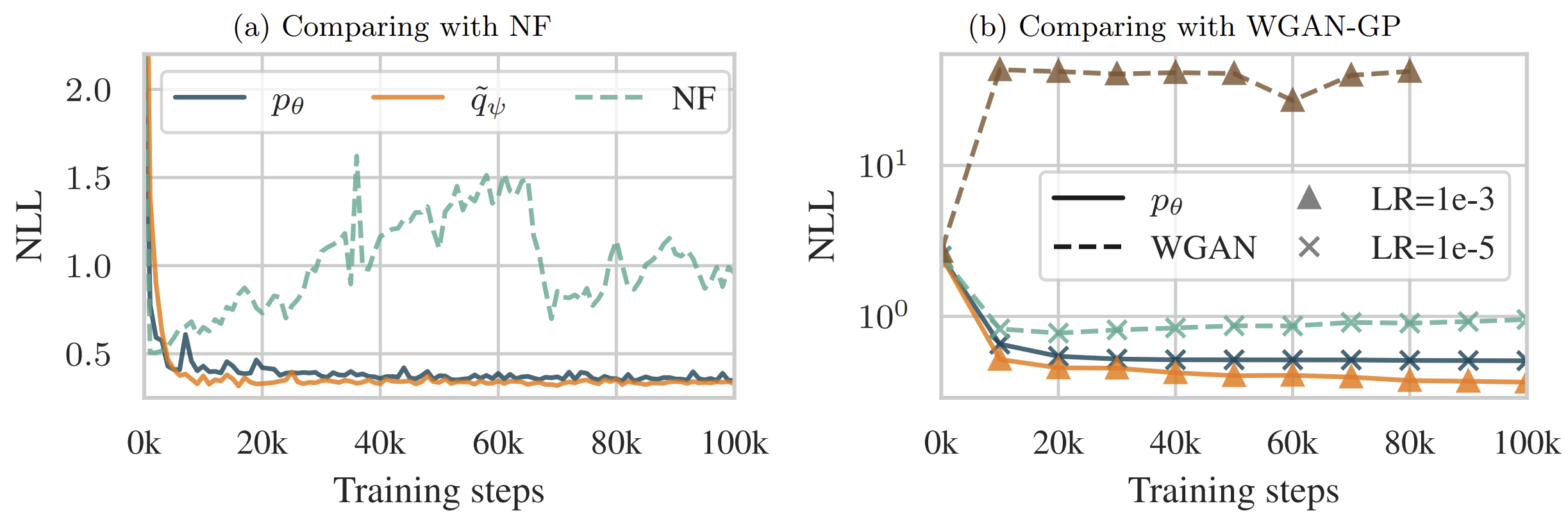 GANs propose another approach to minimize a symmetric divergence based on variational representations, where an additional model is introduced to represent the divergence as an optimization problem. This approach results in a min-max objective that is unstable to train and sensitive to the choice of hyper-parameters.